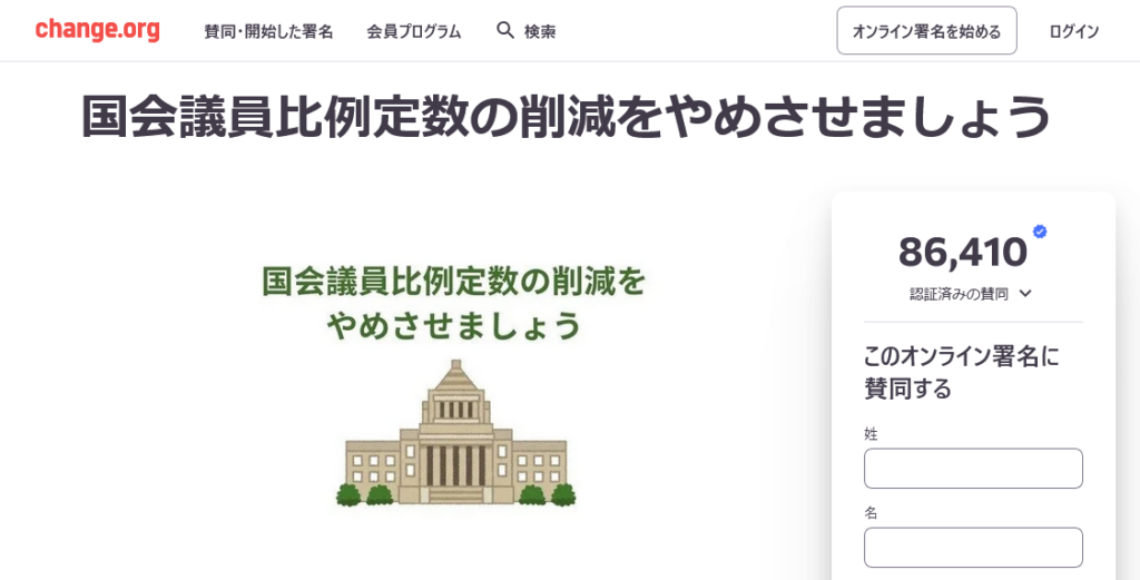 すこしでも民意を届ける方法として、「国会議員比例定数の削減をやめさせましょう」の署名に参加を検討してもいいかもしれません。