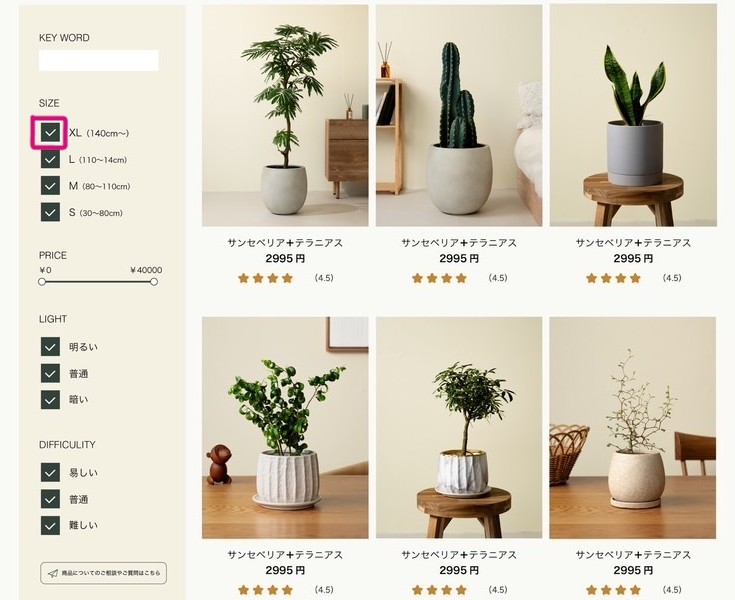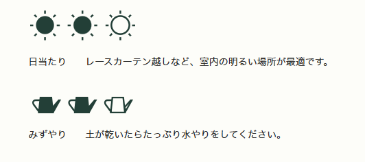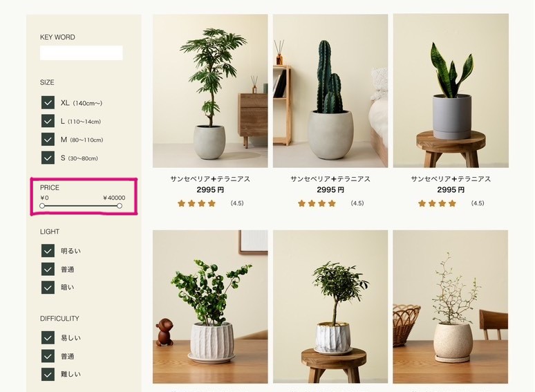 小日向予め、日当たり/水やり用の画像アイコンを予め用意していて、分かりやすい名前でアプロードします。検索エリアは「探す→見つける」を最短化する心臓部。カテゴリ/価格スライダー/在庫絞り/スマホ最適化でノイズとゼロ件を減らし、回遊を意思決定へつなげてCVRと満足度を高めます。