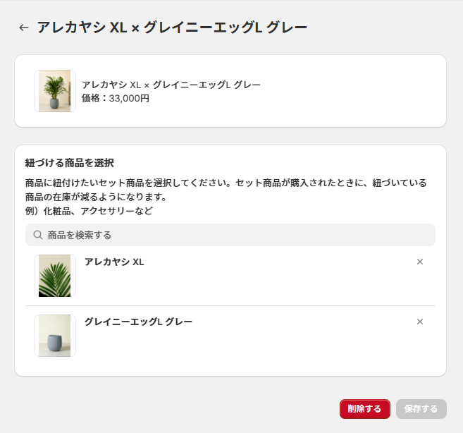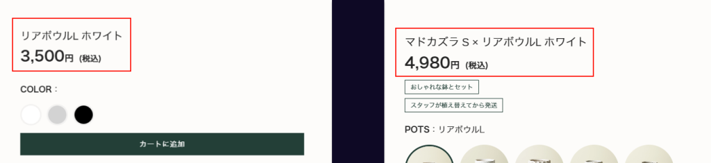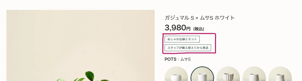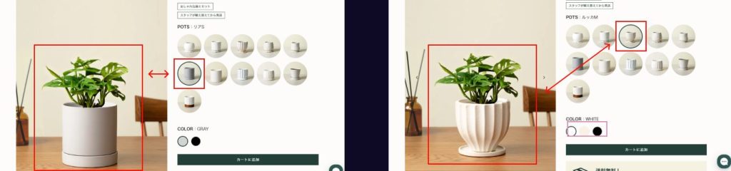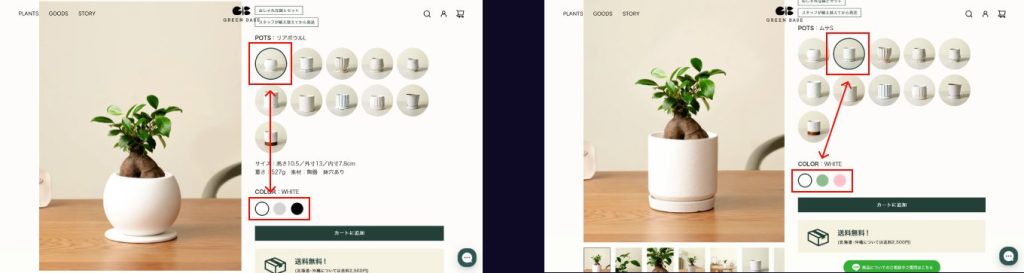 小日向鉢の種類を選択すると、同じ植物+選んだ鉢の商品ページに遷移するようになっています。